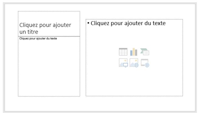 - PowerPoint propose des diapositives préformatées qui contiennent un ou plusieurs espaces réservés à des objets spécifiques. Ici par exemple, une zone de titre, un texte dans une bande étroite à gauche de la diapositive et un contenu à droite de la diapositive (tableau, graphique, SmartArt, image, clipart ou élément multimédia).